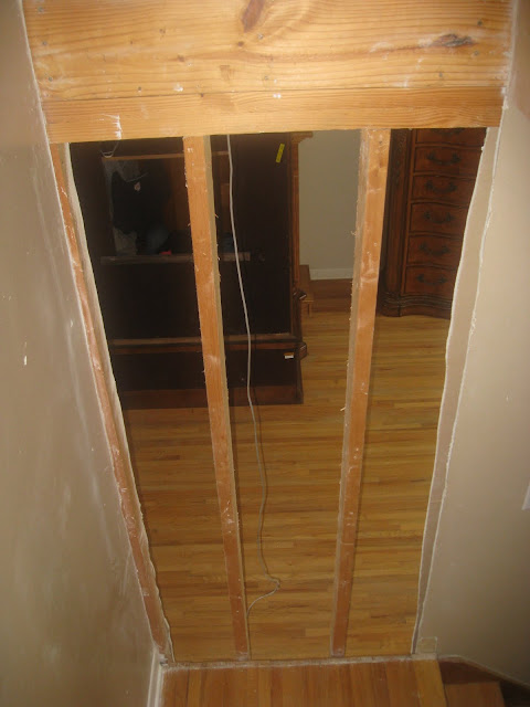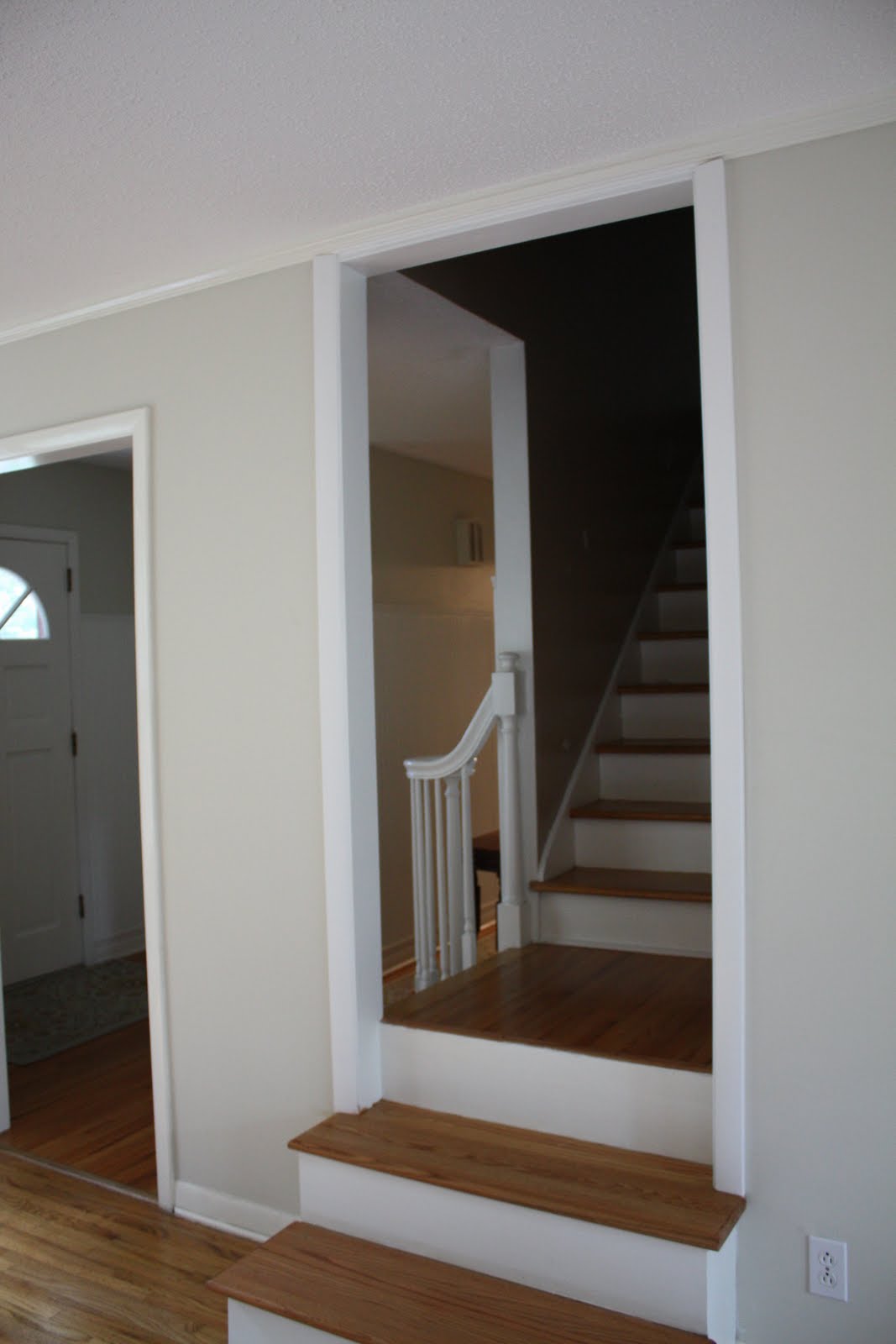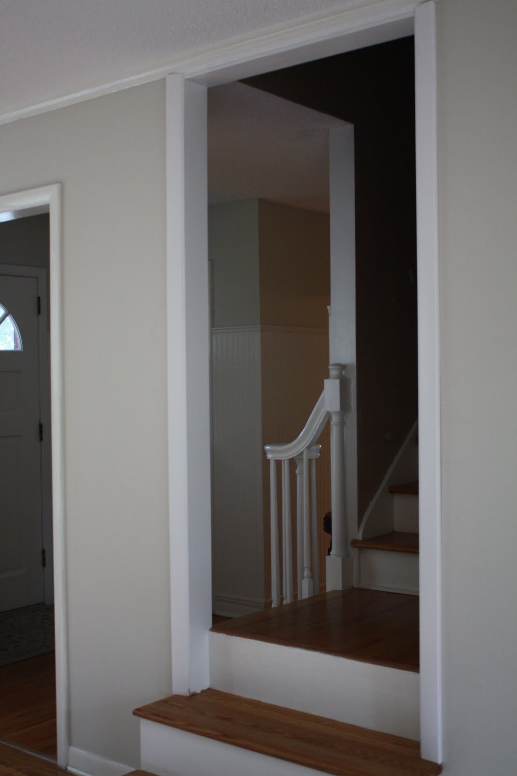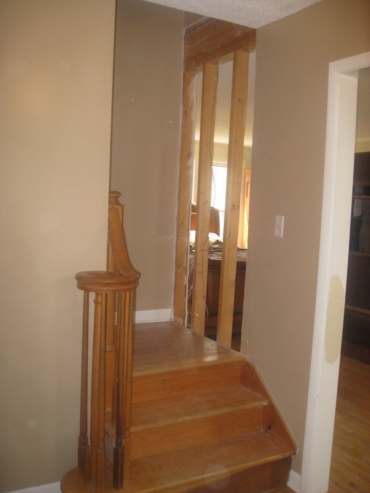 Now, we can take things directly up the stairs instead of trying to make that small 90 degree turn. Finally, our family can enjoy the upstairs of our home too! I still have no idea what the previous owners did...it baffled our contractor as well. ;)