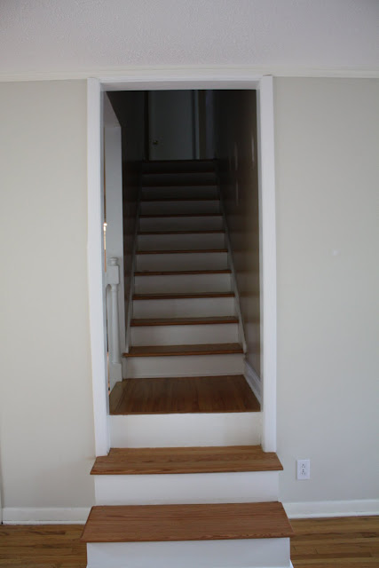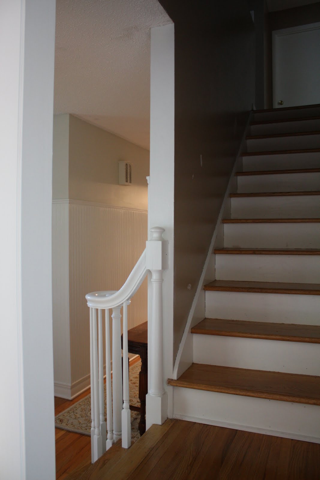 Here is our stairway when we purchased the house. It was dark and tight. Even when we did our walk through I said to my husband, it felt a little small. So skip to move in day, and wouldn't ya know..."sorry ma'am, but this bedroom furniture isn't going to fit up THOSE stairs." AGH!! A full sized box spring wouldn't even make the turn. I was a mess. What were we gonna do??