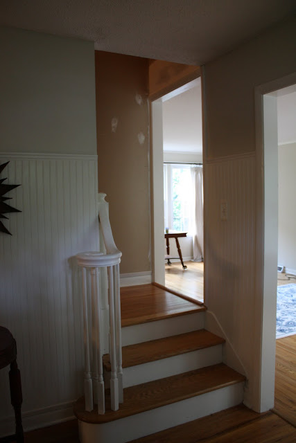 I painted the staircase and rail and we hung bead board down the hallway. Please ignore the ugliness of the staircase wall, we plan on painting the wall and adding bead board here too. |
