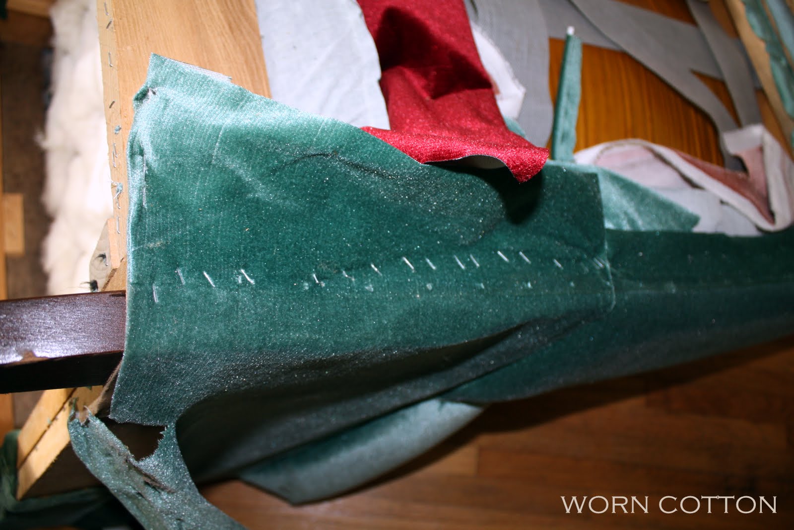 I started out watching a couple of YouTube videos which were mildly helpful, and then I just went for it. I mean, I couldn't mess up that old green fabric. If it failed, it still would have looked better than it started out looking!