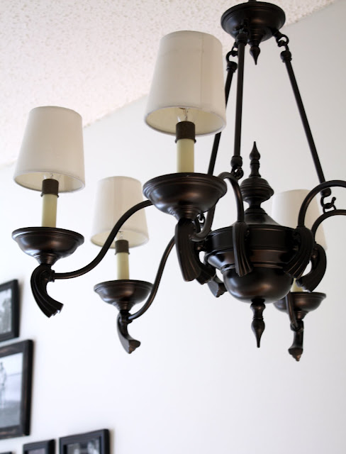 We installed this light when we moved in. I got it from Overstock.com for a steal but hated the color so I spray painted it using Rustoleum's Oil Rubbed Bronze. I got the shade covers from Lowe's and I plan on getting some wax covers to replace the plastic ones.
